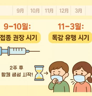 - 항체 형성까지 약 2주 소요되므로, 유행 전 9~10월 접종이 가장 효과적입니다.