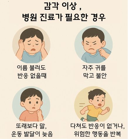 - 발달 지연: 언어나 운동 발달이 늦은 아이에게 감각 이상이 함께 나타날 수 있습니다.