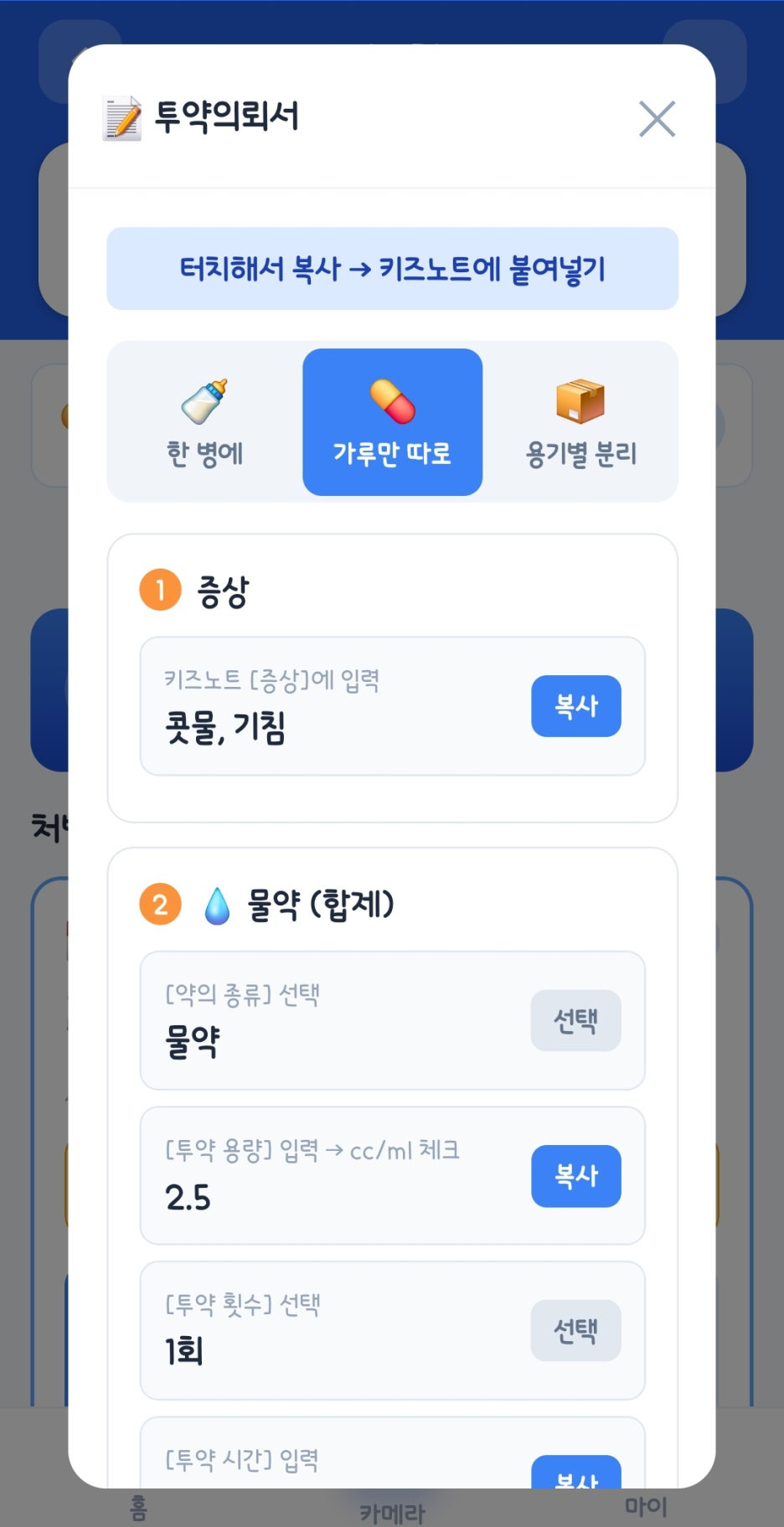 ② 투약 용량 복사 → 키즈노트 [투약 용량]란에 붙여넣기