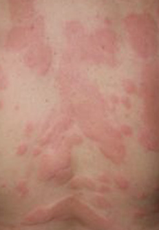 - 두드러기(urticaria): 갑자기 올라왔다가 수시간 내 사라짐, 벌레물림처럼 부풀어 오름
