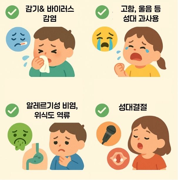 👉 반복적인 고함, 비염, 성대 결절 등을 확인해보는 것이 좋습니다.