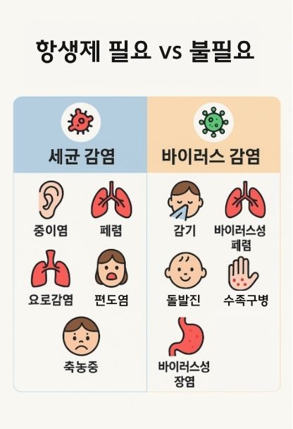 - 항생제는 세균 감염에만 사용