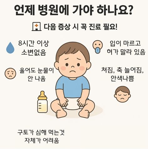 | 🥵 탈수 증상 | 입 마름, 눈물 없음, 기저귀 갈 때 소변량 감소 등 |