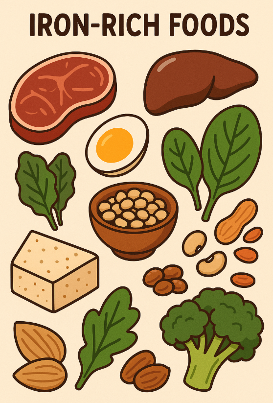 - 동물성 철분(흡수율↑): 소고기, 간, 계란 노른자