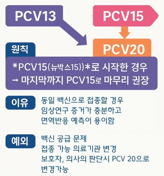 - 예외: 백신 공급 문제, 접종 가능 의료기관 변경, 보호자·의사의 판단 시 PCV20으로 변경 가능